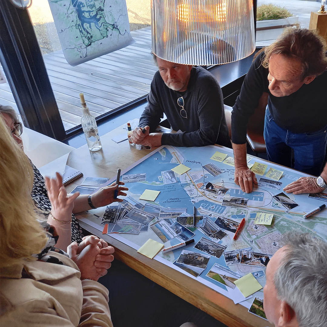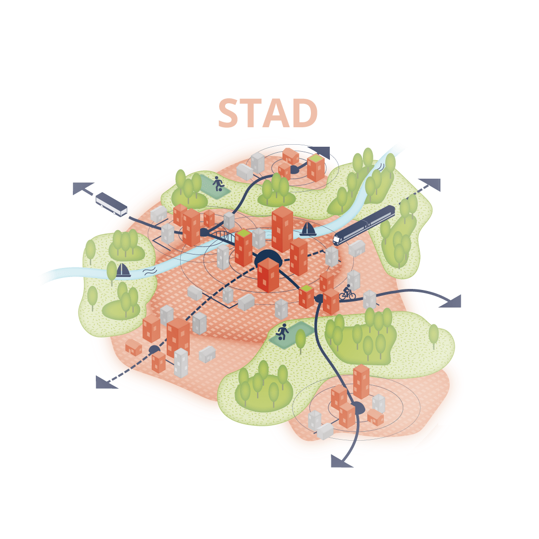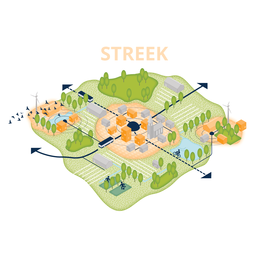 Door ontwerpend onderzoek te combineren met een interactief proces zorgen we, met opdrachtgevers en stakeholders, voor een adaptieve manier van gebiedsontwikkeling en stedelijke transformatie. Dit omvat een heldere gebiedsvisie, waarin landschapsontwikkeling, ondergrondse infrastructuur, fietsroutes en sportvoorzieningen een ruimtelijk raamwerk voor de lange termijn vormen (zie afbeelding). Zo kunnen steden en dorpen groeien en ontstaat er ruimte voor energieopwekking, circulaire landbouw en natuurinclusieve woonclusters.