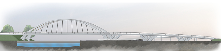 Het ontwerp kenmerkt zich door de strakke eenvoud en heldere beeldtaal, volgens de principes van de Klare Lijn, een stijl die zijn oorsprong heeft in het België van Kuifjes schepper Hergé. De twee vrijstaande bogen vormen letterlijk het hoogtepunt van de brug en zijn goed zichtbaar voor de miljoenen reizigers die jaarlijks in zuidelijke richting de ring Brussel passeren. Een subtiele keuze is de configuratie van de hangers onder beide bogen. Zij hebben een gezamenlijk virtueel verdwijnpunt 80 meter boven het midden van de brug. Dit geometrische uitgangspunt zorgt ervoor dat de hangers elkaar nooit visueel kruisen. Bijkomend gevolg van deze configuratie is dat de optimale druklijn van de boog erdoor beïnvloed wordt; de boog wordt als het ware spitser dan de meer gebruikelijke parabolische bogen die passen bij verticale tuien. De bogen verjongen naar boven toe, al naar gelang de drukkracht in de boog afneemt. De geboorte van de bogen is daarentegen breed aangezet om laterale stabiliteit te leveren ter compensatie van de afwezigheid van dwarsverbindingen tussen de bogen.